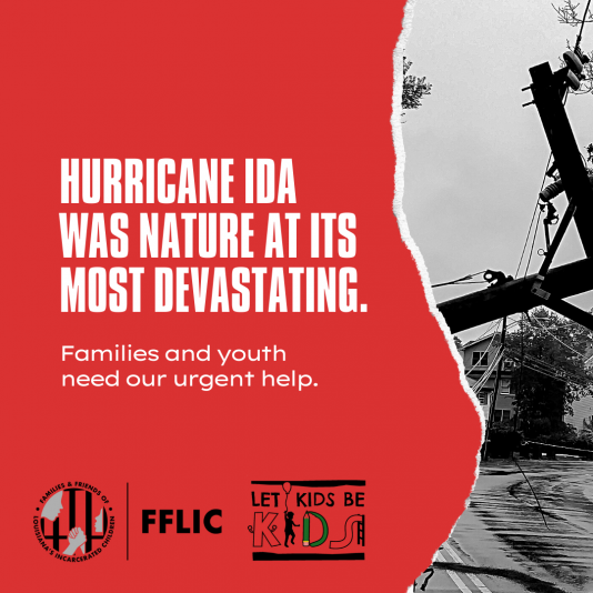 As you are all keenly aware, Category 4 Hurricane Ida hit landfall Sunday, August 29th, and has devastated much of Louisiana. We remain under continued flood as well as tornado warnings while unable to fully comprehend the level of damage, injuries, and lives lost. Communication has been difficult with ongoing power outages in southeastern Louisiana but we will share updates with you as we are able to. We appreciate your outpouring of concern through calls and emails of encouragement. Thankfully, our staff evacuated the city in time but we do not know the full impact on our homes, families, and the community of New Orleans as we’ve been advised to delay returning home. We are reaching out to our chapter members, especially those families hit hardest by last year’s epic hurricane season, and are hearing stories of flooding, rescues, and people trapped under debris from fallen buildings and houses. We are all cognizant of the horrific irony of Hurricane Ida’s landfall on the 16th Anniversary of Hurricane Katrina. Having survived the aftermath of Katrina and its prolonged and unforeseen long-term impacts, we are preparing ourselves for the long haul of recovery and rebuilding. One of the lessons learned from post-Katrina recovery was the rise of the predatory practices that target those most vulnerable. FFLIC will remain vigilant, advocating for coordinated public services to support families in need, and protect the rights of impacted youth. We learned from the Office of Juvenile Justice on Sunday that children held in custody at Bridge City Correctional Facility for Youth (BCCY) were evacuated over the weekend to other facilities. At this time, we do not have more information. However, we remain diligent about securing additional information and advocating for the protection of the physical and mental health of our children, especially with the rise of COVID infections within youth prisons. As seen in national news coverage, the devastation of Hurricane Ida combined with rising coronavirus cases is a major public health emergency. We will continue to monitor and advocate for the safe release of incarcerated children dealing with the emotional trauma of this new disaster who are at very high risk of infection in an institutional environment that cannot adequately provide for their care and safety. Last week, FFLIC was in the midst of preparations to celebrate our 20th Anniversary with a Virtual Gala Benefit on September 10, but due to these tragic circumstances, we must postpone this event in order to focus all our efforts on supporting our communities. If you are wondering how to get donations directly to families in need, FFLIC provides emergency funds to sustain member families as they attempt to recover and rebuild. OUR FAMILIES AND YOUTH NEED YOUR HELP--- PLEASE DONATE NOW. Your compassionate and generous contribution will be used to provide families with emergency stipends while they await FEMA support as well as allow FFLIC to continue to outreach and advocate for those most directly impacted by this crisis. We are thankful that the Biden Administration moved quickly to recognize this as a federal disaster so that families may register for FEMA support. We encourage everyone to come together to help each other survive and be safe over the next several days and weeks. FFLIC is here to help. Contact us via email at info@fflic.org or call us at (504) 708-8376. We will keep you updated. Please help in any way that you can. FFLIC is preparing for a long journey ahead and we need your support. We wish for the continued safety and health of us all. Thank you for your solidarity and compassion. In community, Gina Womack Co-Founder, Executive Director